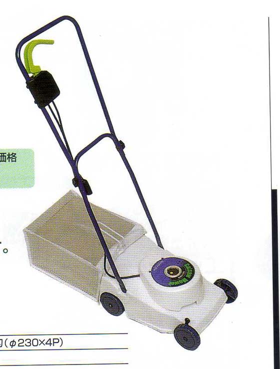 電気ロータリ式・刈払機用4枚刃。100V・50Hz/60Hz・500W。刈り巾230mm。刈り高さ:10、15、20、25mm(レバー4段調節)。サイズ;長さ980×巾320×高さ800mm。重さ6.3Kg。回転確認用スコープ、強制集草ファン、10m延長コード、過電流防止回路付。